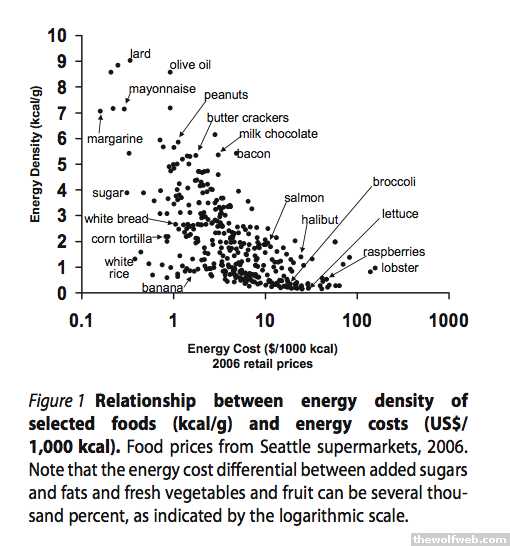 i try my best not to eat processed and packaged foods, sticking as exclusively as possible to fresh fruits, veggies, and butchered meats.If i'm frugal, my monthly grocery bill averages to about $9-10/day.At this stage in my life, i do not think that's high. For many, I can totally understand how that'd be impossible, esp. if an entire family was trying to live off my salary alone.on the other hand, doing the OPs argument by $/calorie seems silly.. you'd need to compare on some other scale than calorie.